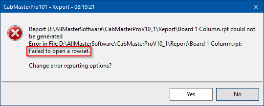 CabMaster cannot find the Schema.ini file that is used to assist with the layout of the reports. Typically inside the CabMaster file paths there is a backup file you can obtain to repair this.